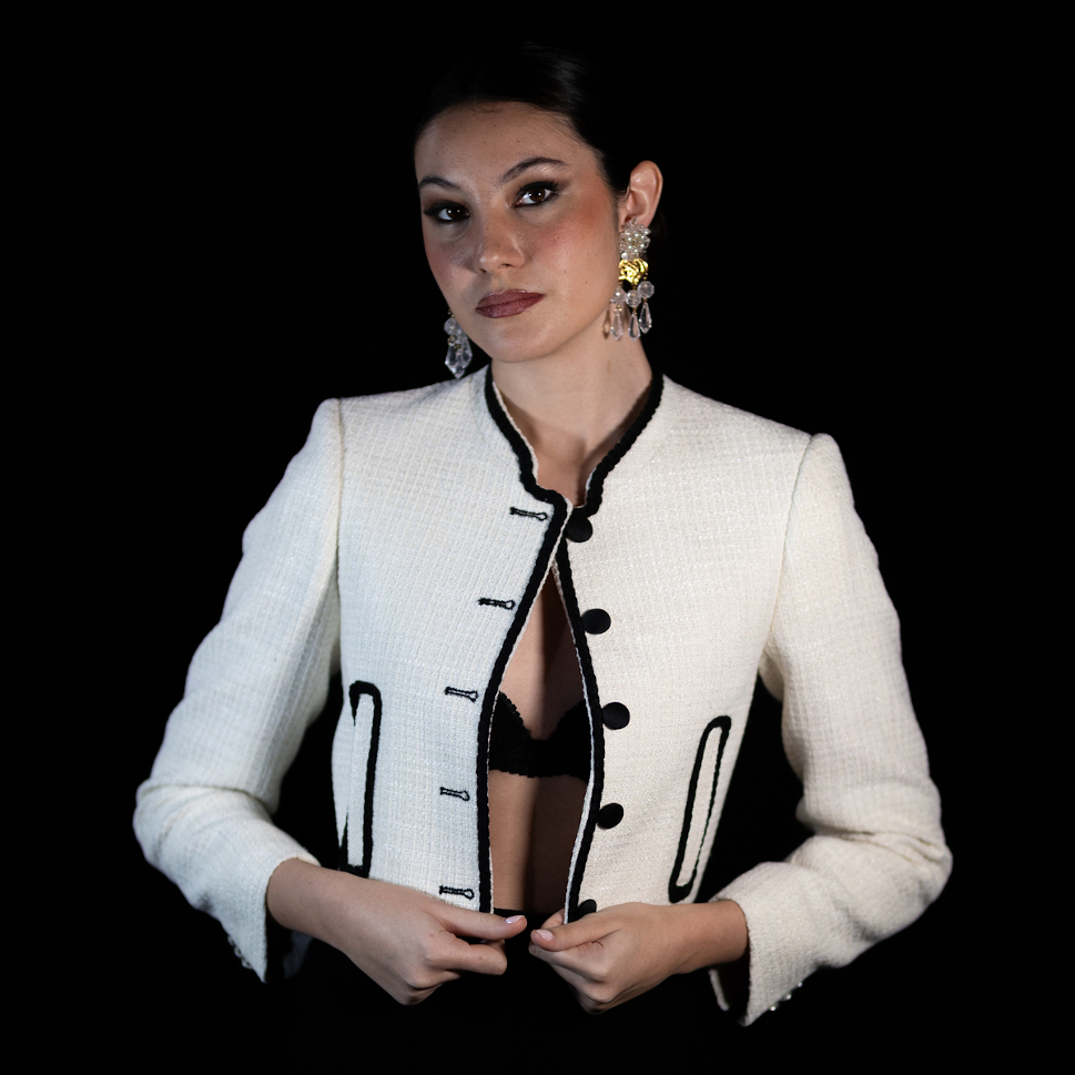 Chaqueta de inspiración campera en tejido tweed hueso con pasamanería lazo negra, combina botones forrados en negro y detalles que realzan la silueta femenina con fuerza y gracia. Ideal para eventos por su sobriedad y sofisticación.
